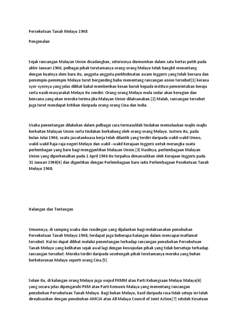 423 Perjanjian Persekutuan Tanah Melayu 1948 Nota Sejarah Tingkatan 5 Bab 4. Sesuatu hal dll yang berlaku menarik perhatian dll kejadian perkara. Pengenalan Malayan Union di Tanah Melayu pada tahun 1946 telah menunjukkan penyatuan masyarakat terhadap penjajahan British.
